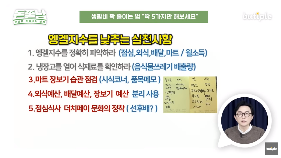 마지막으로, 점심식사 더치페이 문화를 정착시켜야 합니다. 첫 번째부터 네 번째까지 잘 지켰는데 이상하게 엥겔지수가 안 떨어지는 분들은 밥을 사는 습관이 있으신 분들이 많이 계십니다.